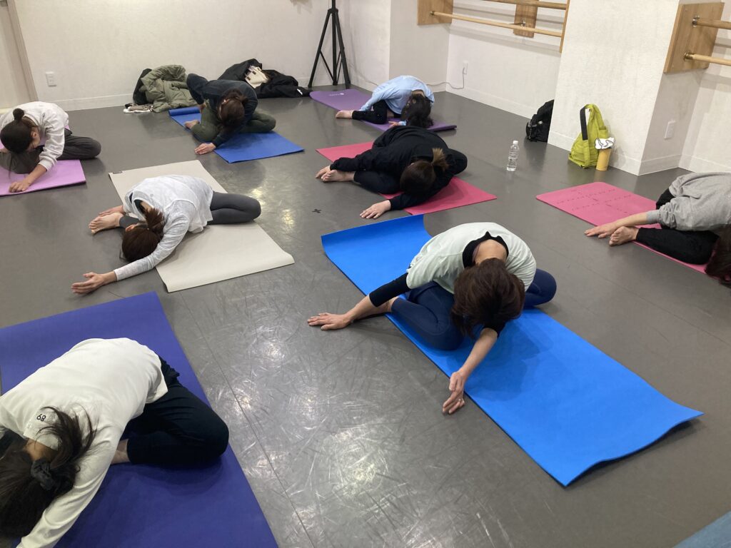 肩こり、股関節痛などの緩和、レッスンの最初と最後で、呼吸の深さや柔軟性の違いを実感いただけます。